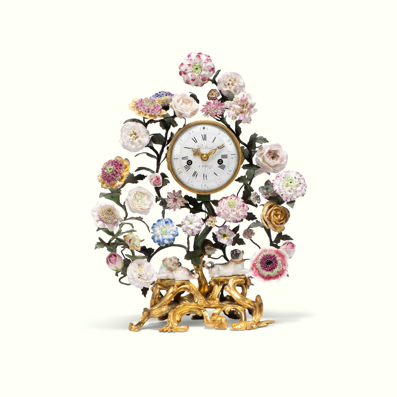 ‘This Louis XV clock, with its abundant Vincennes flowers sheltering two reclining Meissen pugs, encapsulates 18th century lightness and art de vivre.’